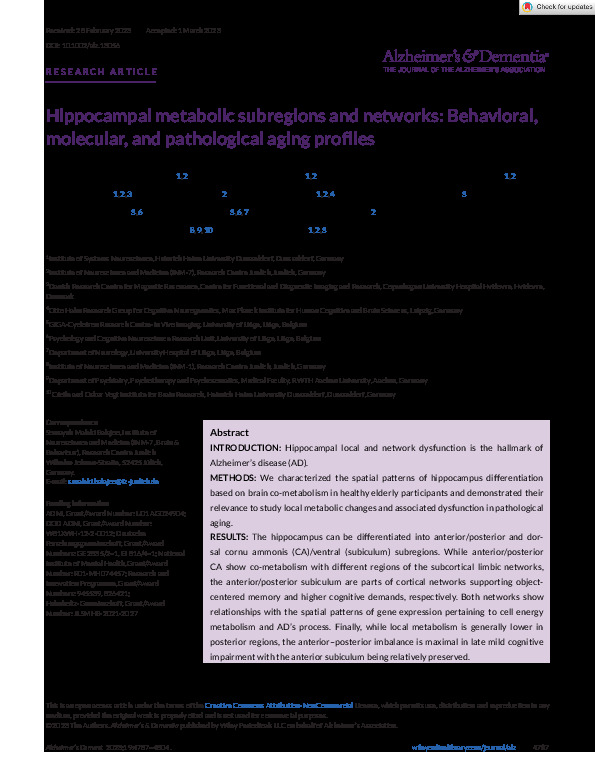 Home > Publications database > Hippocampal metabolic subregions and networks: Behavioral, molecular, and pathological aging profiles > Access to Fulltext |