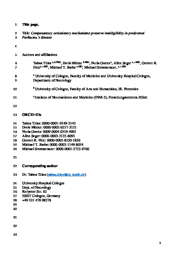 | Hauptseite > Publikationsdatenbank > Compensatory articulatory mechanisms preserve intelligibility in prodromal Parkinson's disease > Zugang zum Volltext |