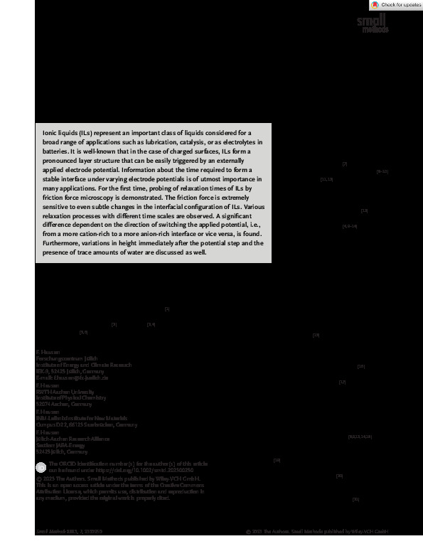 Small Methods - 2023 - Hausen - Relaxation Times of Ionic Liquids under Electrochemical Conditions Probed by Friction Force.jpg (icon-180) [26.29 KB] 12 Jan 2024, 06:15 OpenAccess