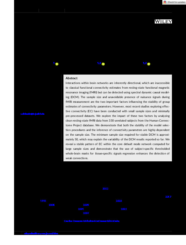 Hauptseite > Publikationsdatenbank > Impact of sample size and regression of tissue‐specific signals on effective connectivity within the core default mode network > Zugang zum Volltext