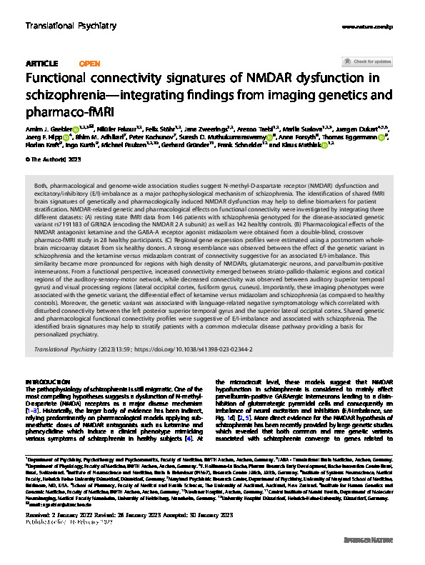 Home > Publications database > Functional connectivity signatures of NMDAR dysfunction in schizophrenia—integrating findings from imaging genetics and pharmaco-fMRI > Access to Fulltext |