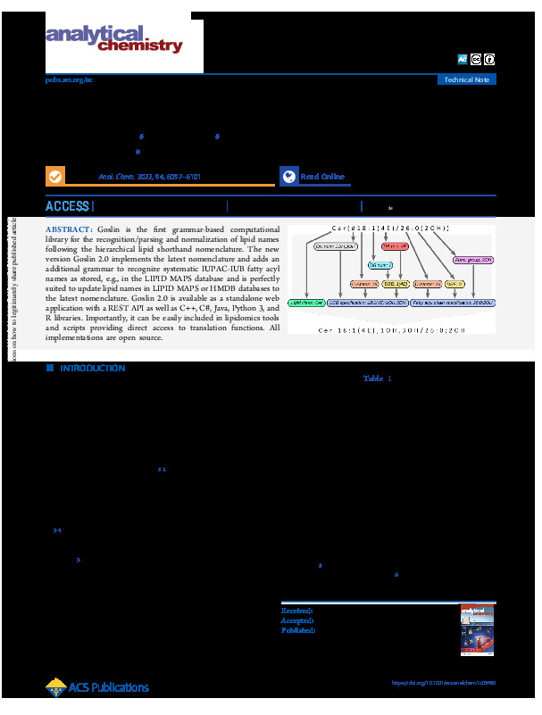 Home > Publications database > Goslin 2.0 Implements the Recent Lipid Shorthand Nomenclature for MS-Derived Lipid Structures > Access to Fulltext |