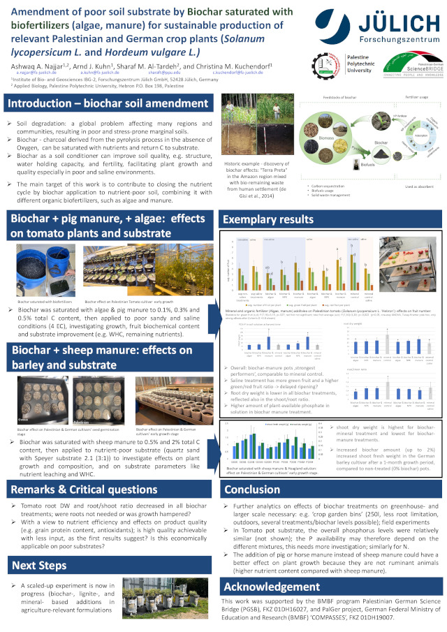 Amendment of poor soil substrate by biochar saturated with biofertilizers (algae, manure) for sustainable production of relevant Palestinian and German crop plants Solanum lycopersicum L. and Hordeum vulgare L. - FZJ-2024-00479