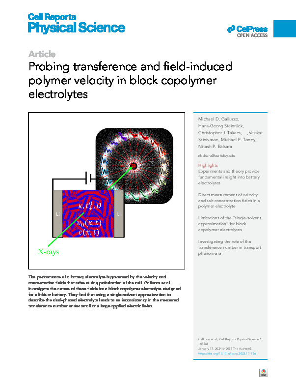 Home > Publications database > Probing transference and field-induced polymer velocity in block copolymer electrolytes > Access to Fulltext |