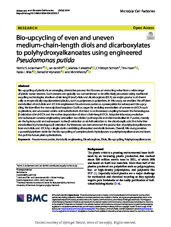 Hauptseite > Publikationsdatenbank > Bio-upcycling of even and uneven medium-chain-length diols and dicarboxylates to polyhydroxyalkanoates using engineered Pseudomonas putida > Zugang zum Volltext