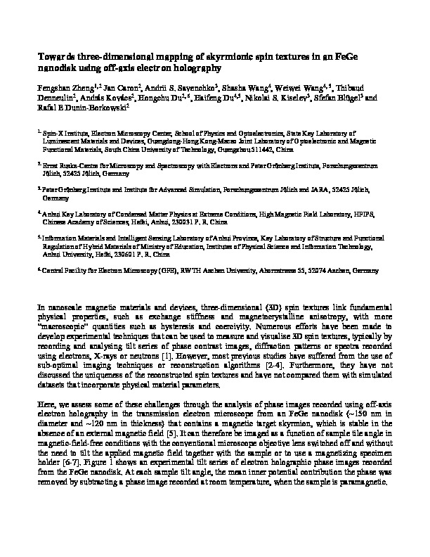Home > Publications database > Towards Three-dimensional Mapping of Skyrmionic Spin Textures in an FeGe Nanodisk Using Off-axis Electron Holography > Access to Fulltext |