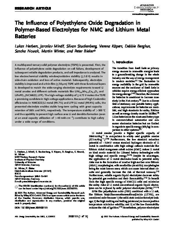Adv Energy and Sustain Res - 2023 - Herbers - The Influence of Polyethylene Oxide Degradation in Polymer‐Based Electrolytes.pdf [2.75 MB] 09 Apr 2024, 10:52 OpenAccess