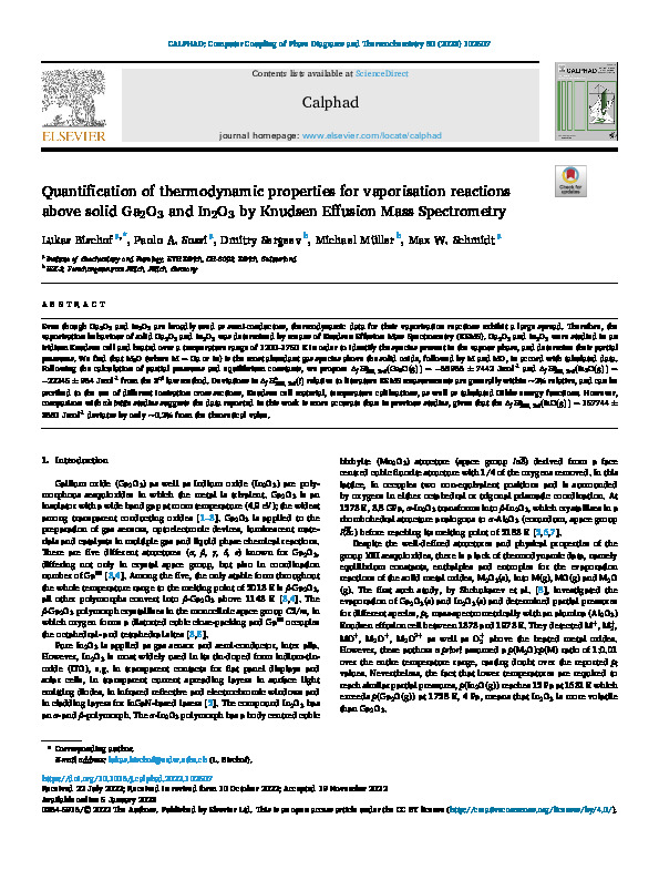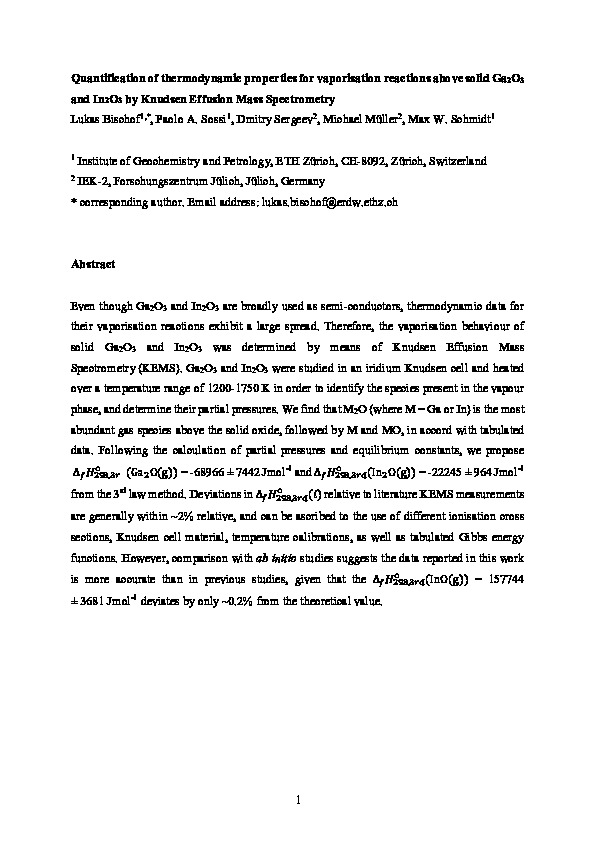 | Home > Publications database > Quantification of thermodynamic properties for vaporisation reactions above solid Ga2O3 and In2O3 by Knudsen Effusion Mass Spectrometry > Access to Fulltext |