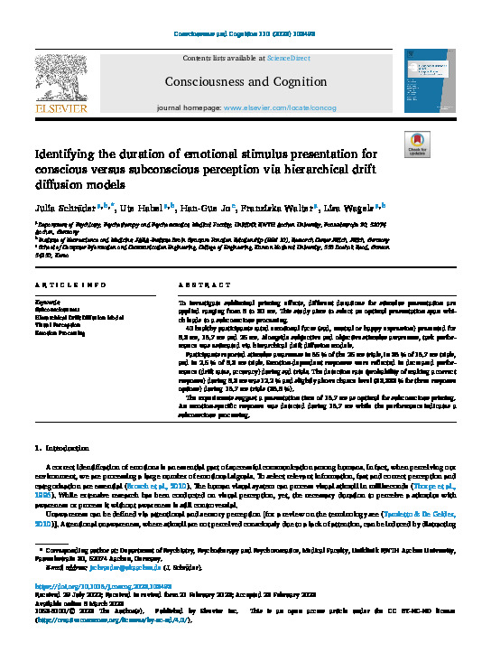 Home > Publications database > Identifying the duration of emotional stimulus presentation for conscious versus subconscious perception via hierarchical drift diffusion models > Access to Fulltext |