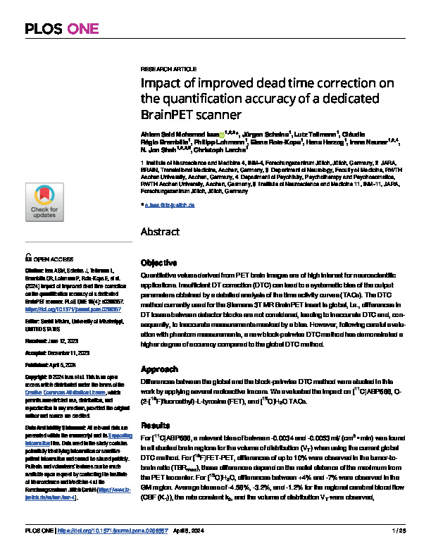 Home > Publications database > Impact of improved dead time correction on the quantification accuracy of a dedicated BrainPET scanner > Access to Fulltext |