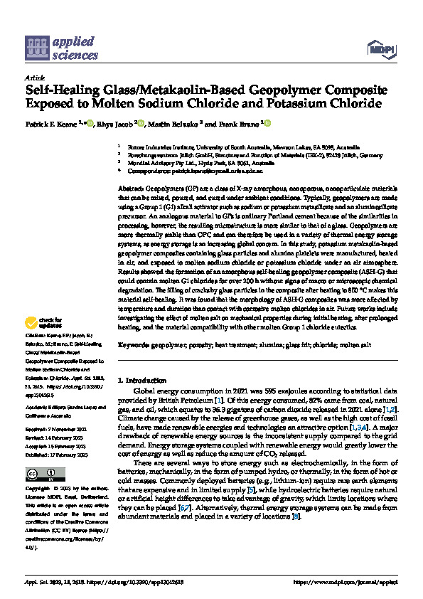 Home > Publications database > Self-Healing Glass/Metakaolin-Based Geopolymer Composite Exposed to Molten Sodium Chloride and Potassium Chloride > Access to Fulltext