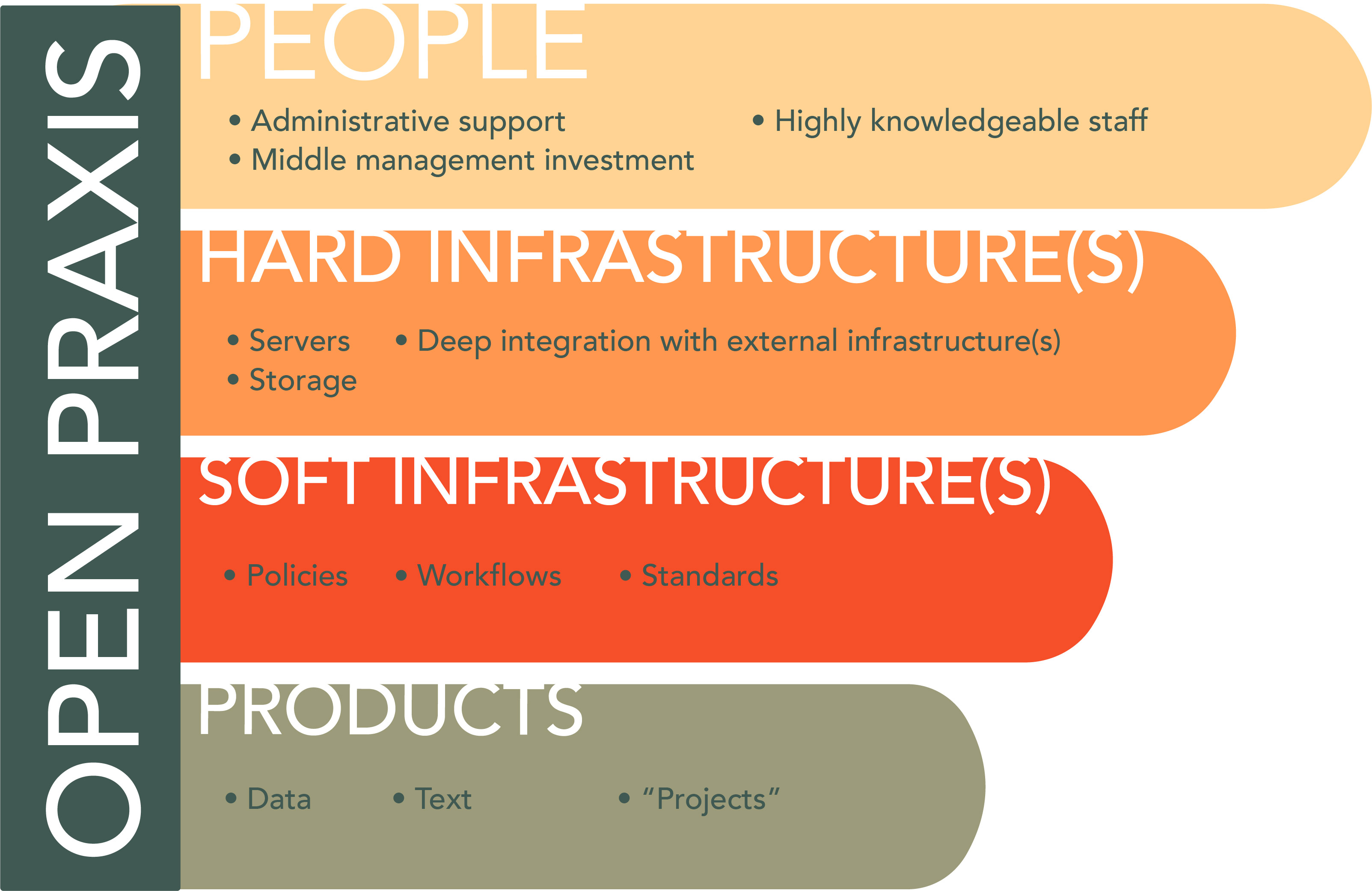 Abstract: This graphic was developed for a presentation at the Association of College and Research Libraries 2019 conference in Cleveland, Ohio for a panel titled 'Advocating for Open: Putting Ethics into Practice.' The design is inspired by a graphic in Wolski, M., & Richardson, J. (2014). A Model for Institutional Infrastructure to Support Digital Scholarship. Publications, 2(4), 83–99. https://doi.org/10.3390/publications2040083 . Micah Vandegrift conceptualized the graphic and Abby Vandegrift created the design.