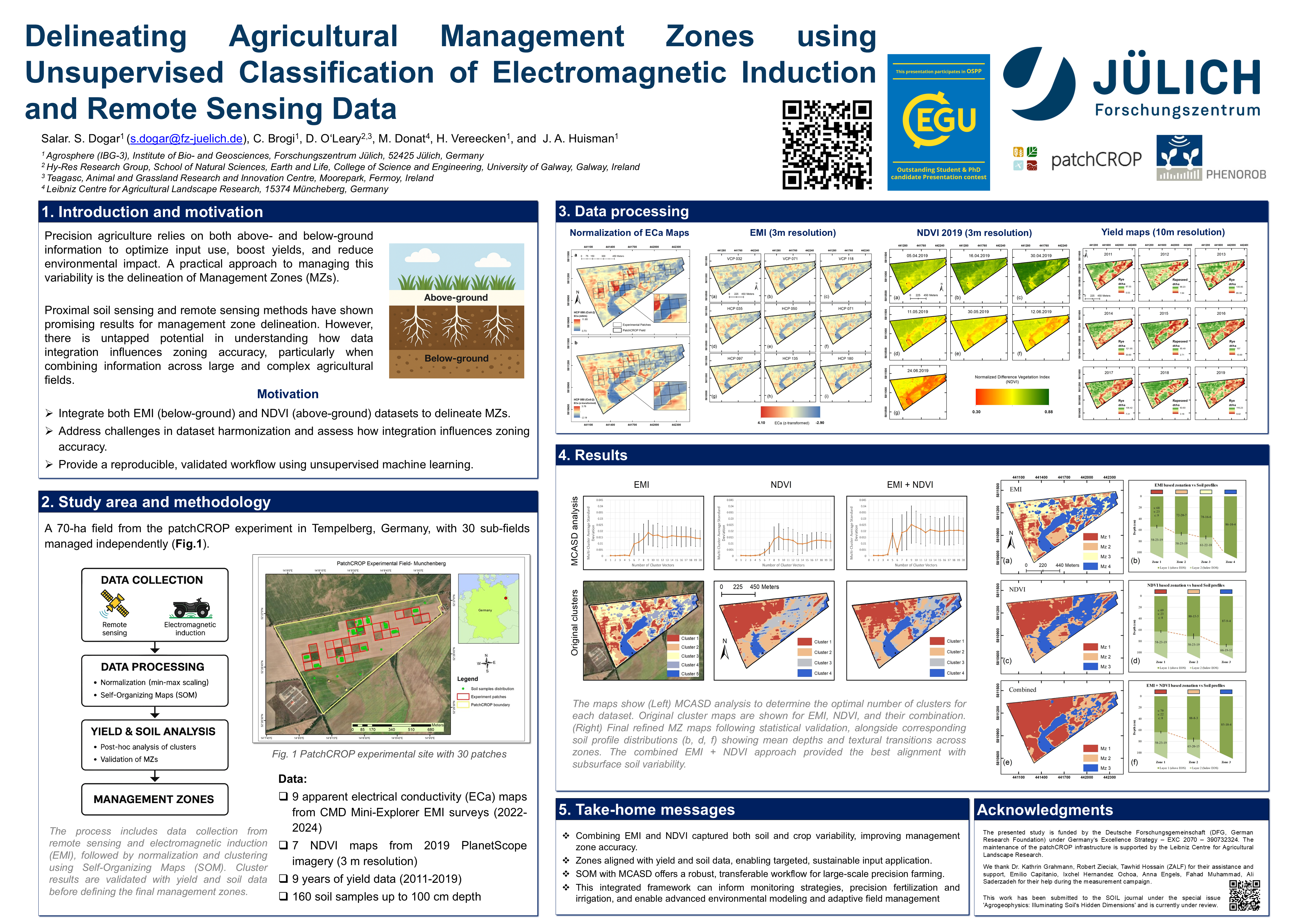 Abstract: An accurate delineation of management zones that reliably characterizes within-field heterogeneity is essential to optimize resources and improve yields in precision agriculture. Non-invasive hydro-geophysical methods, such as electromagnetic induction (EMI), offer a rapid approach to delineating agricultural management zones that are based on subsurface soil characteristics that influence crop growth. Integrating additional data sources, such as remote sensing imagery and yield maps, can further enhance the quality and applicability of these management zones. However, integrating above-ground and subsurface information from multiple datasets for large agricultural fields poses challenges in data harmonization, analysis, and methodological consistency. Additionally, the impact of different dataset combinations on management zone delineation remains underexplored.In this study, we propose a robust processing workflow that combines unsupervised classification and statistical validation to delineate management zones using proximal and remote sensing. This method was applied to a 70-ha field of the patchCROP experiment in Tempelberg (Germany). Part of this field consists of 30 small patches (0.5 ha each) that are managed separately since 2020. EMI data were collected in four campaigns between 2022 and 2024 by using a CMD Mini-Explorer and a CMD Mini-Explorer Special-Edition (featuring 3 and 6 coil separations, respectively). Maps of measured ECa were standardized using z-score normalization (ECaz) to reduce the effect of measuring in different environmental conditions. Additionally, seven satellite images of the 2019 growing season with 3 m resolution (PlanetScope) were used to obtain maps of NDVI development. Three dataset combinations were investigated: 1) ECaz maps, 2) NDVI maps, and 3) a combination of the EMI and NDVI maps. The Self-Organizing Maps (SOM) machine learning technique was used to cluster these three datasets. The optimal number of clusters was determined using the Multi-Cluster Average Standard Deviation (MCASD) method. Nine years (2011-2019) of yield data and detailed soil information up to 100 cm depth were used to refine the cluster numbers by using Tukey's post-hoc analysis and to assess the accuracy of the clustered maps with two-tailed t-tests in a subsequent step.The EMI-based clustering resulted in 4 management zones. A comparison of adjacent zones showed that 15 out of 21 soil properties and 23 out of 27 yield combinations were statistically separated. The average p of all these combinations was 0.113 and 0.045, respectively. The NDVI-based clustering resulted in 3 zones with 10 out of 14 soil properties and 18 out of 18 yield combinations showing significant separation (average p of 0.166 and 0.001, respectively). Overall, the EMI-based zones better captured the patterns in soil heterogeneity, whereas the NDVI-based zones better matched yield maps. The combined EMI-NDVI clustering resulted in 3 zones, and all the combinations of soil properties and yield showed significant separation. This EMI-NDVI derived 3 m resolution map better represented soil properties and yield maps, highlighting the potential of integrating multi-source datasets for field management and, ultimately, agricultural productivity. It represents the base for actionable insights not only for precision agriculture applications such as fertilization and irrigation, but also for environmental modelling or to guide future sampling campaigns.