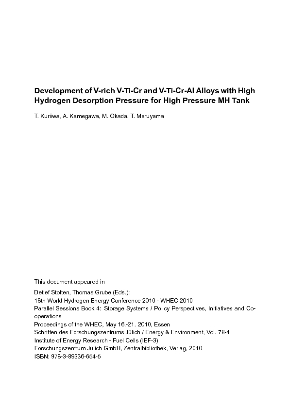 Home > IEK > IEK-3 > Development of V-rich V-Ti-Cr and V-Ti-Cr-Al Alloys with High Hydrogen Desorption Pressure for High Pressure MH Tank > Access to Fulltext |
