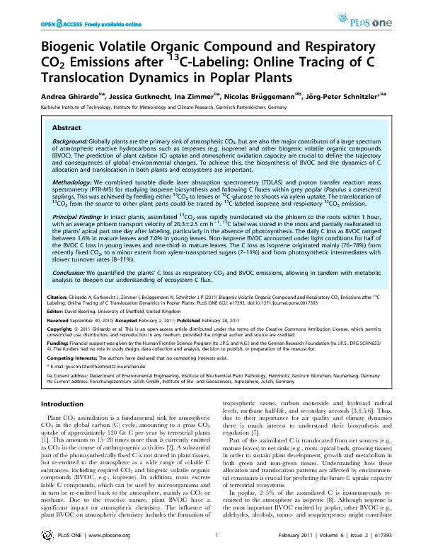 Home > Publications database > Biogenic Volatile Organic Compound and Respiratory CO2 Emissions after 13C-Labeling: Online Tracing of C Translocation Dynamics in Poplar Plants > Access to Fulltext |