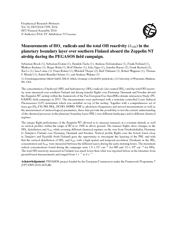 Home > Workflow collections > Public records > Measurements of HOx radicals and the total OH reactivity (kOH) in the planetary boundary layer over southern Finland aboard the Zeppelin NT airship during the PEGASOS field campaign > Access to Fulltext
