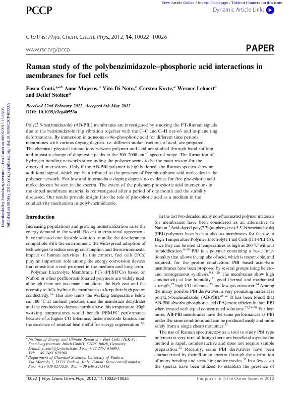 | Home > Publications database > Raman study of the polybenzimidazole - phosphoric acid interactions in membranes for fuel cells > Access to Fulltext |
