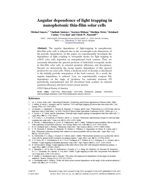 OE23_A1575_Angular dependence of light trapping in nanophotonic thin-film solar cells