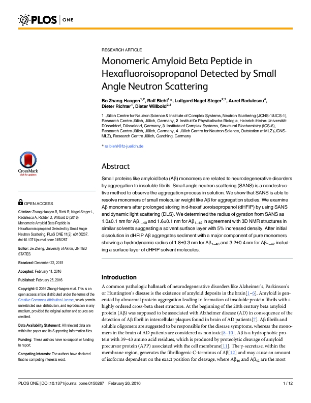 Monomeric Amyloid Beta Peptide in Hexafluoroisopropanol Detected by Small Angle Neutron Scattering_2016.pdf (pdfa) [1.71 MB] 13 Apr 2016, 14:29 OpenAccess