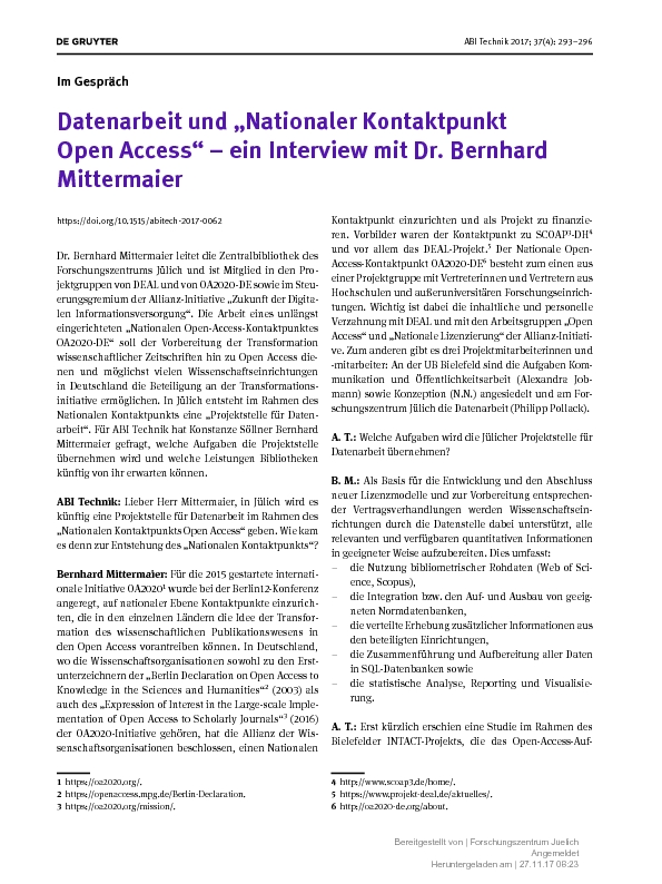 Home > Publications database > Datenarbeit und „Nationaler Kontaktpunkt Open Access“ – ein Interview mit Dr. Bernhard Mittermaier > Access to Fulltext