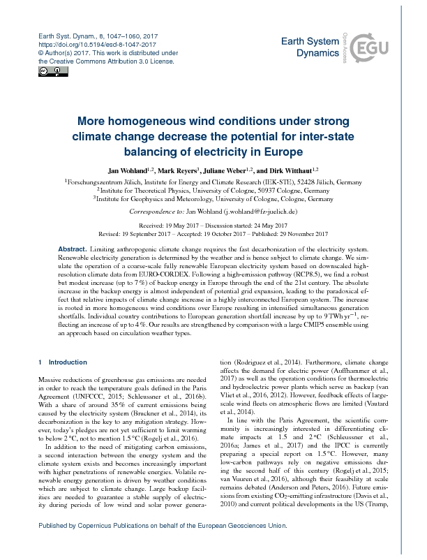 | Home > Publications database > More homogeneous wind conditions under strong climate change decrease the potential for inter-state balancing of electricity in Europe > Access to Fulltext |
