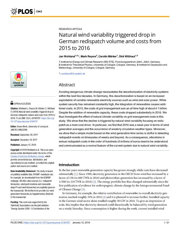 Home > Publications database > Natural wind variability triggered drop in German redispatch volume and costs from 2015 to 2016 > Access to Fulltext |